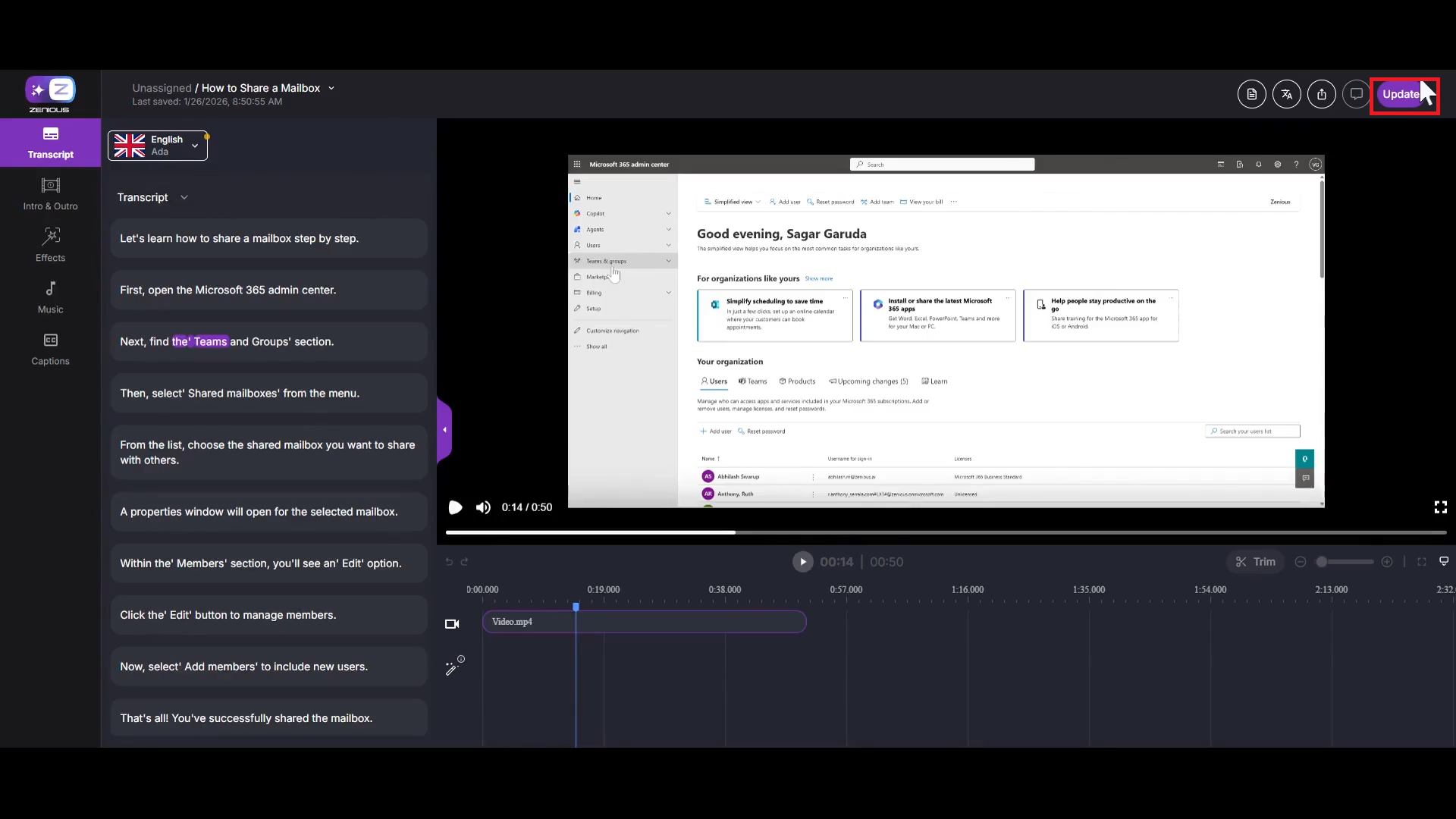 Click the Update button to apply the new voice to your video. The transcript is generated with the new voiceover.