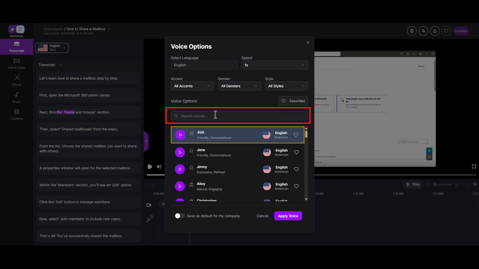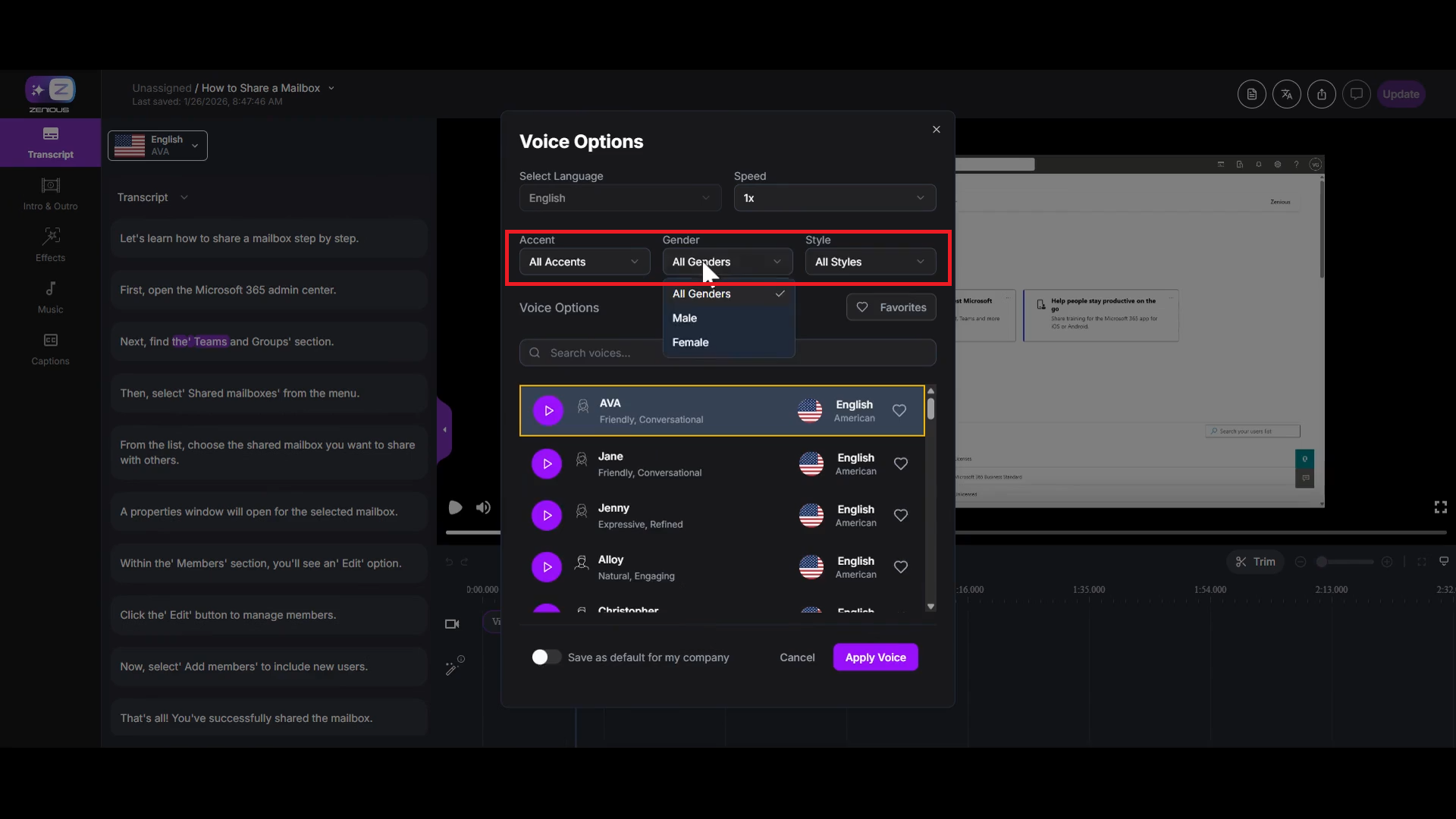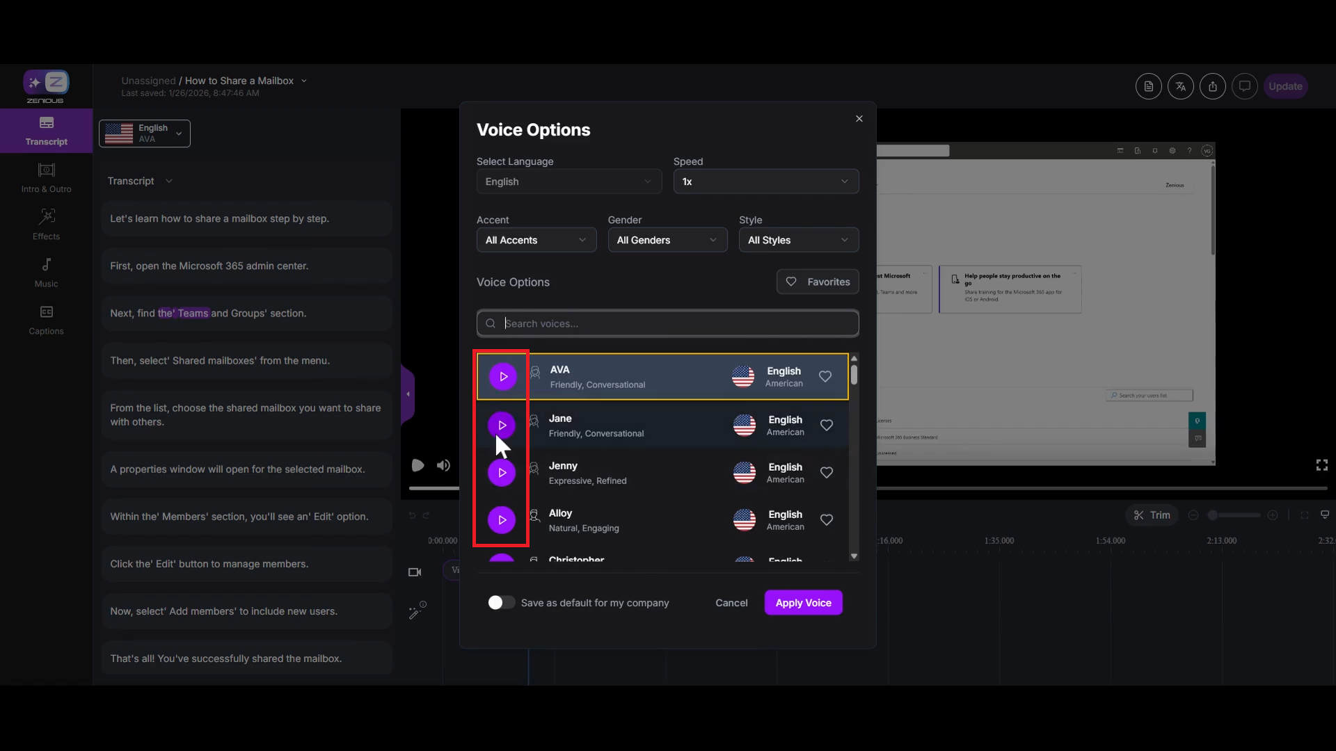 Changing the AI voice in your Zenious video allows you to customize the voiceover to better match your content, audience, or brand preferences. By selecting from a variety of available voices, you can adjust accent, gender, or style to achieve the desired effect. Customizing the voiceover can enhance viewer engagement and ensure consistency with your company’s branding.