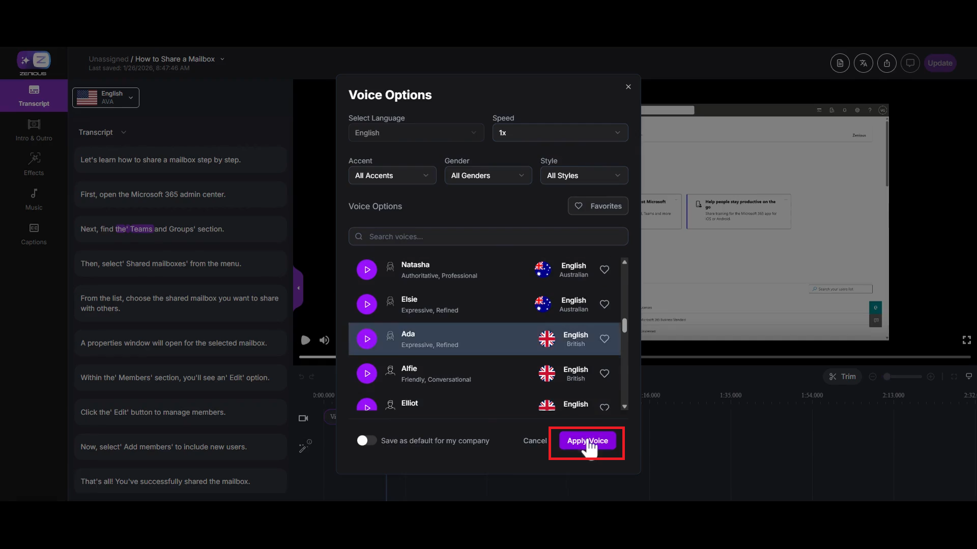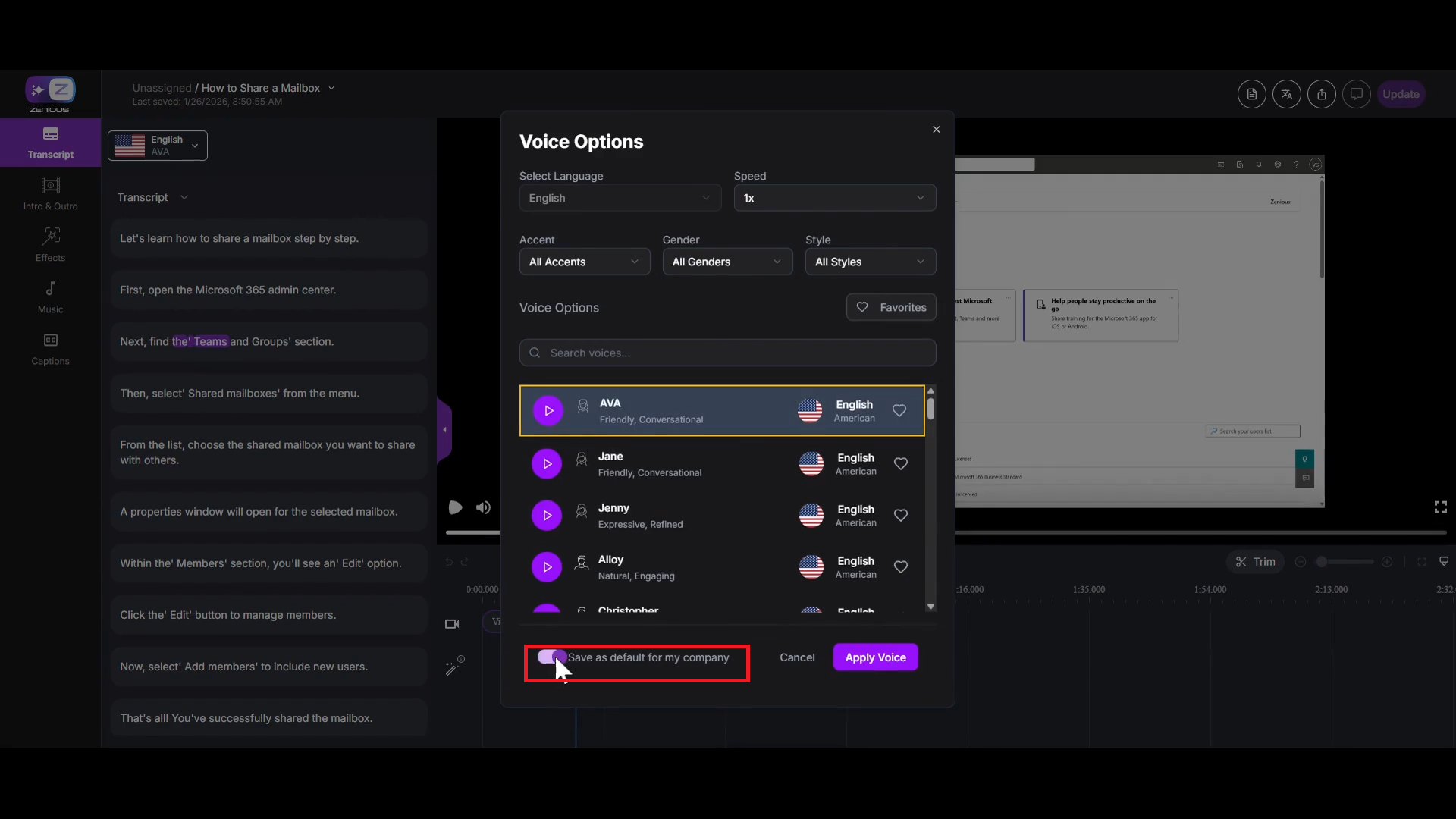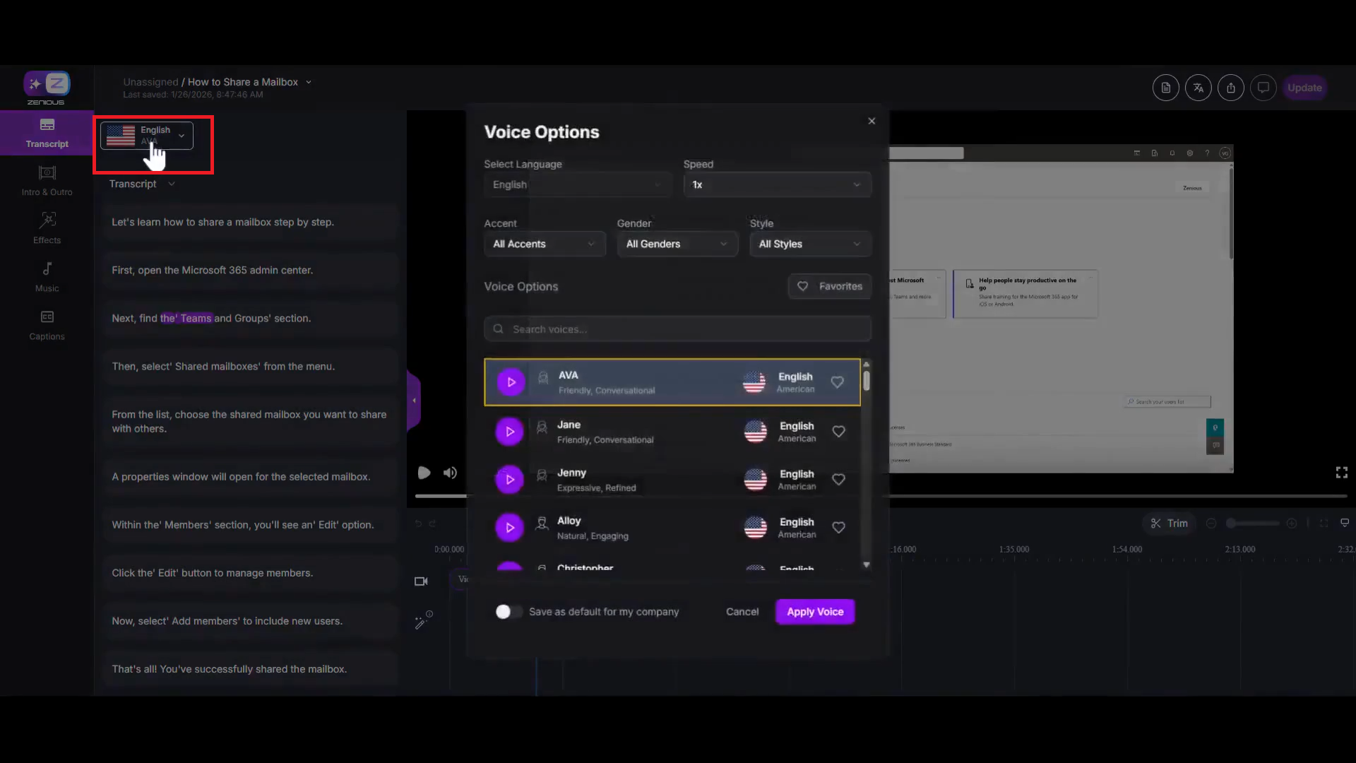 After you Update the video (see step 8), all new videos processed in Zenious will use your newly selected default voice.