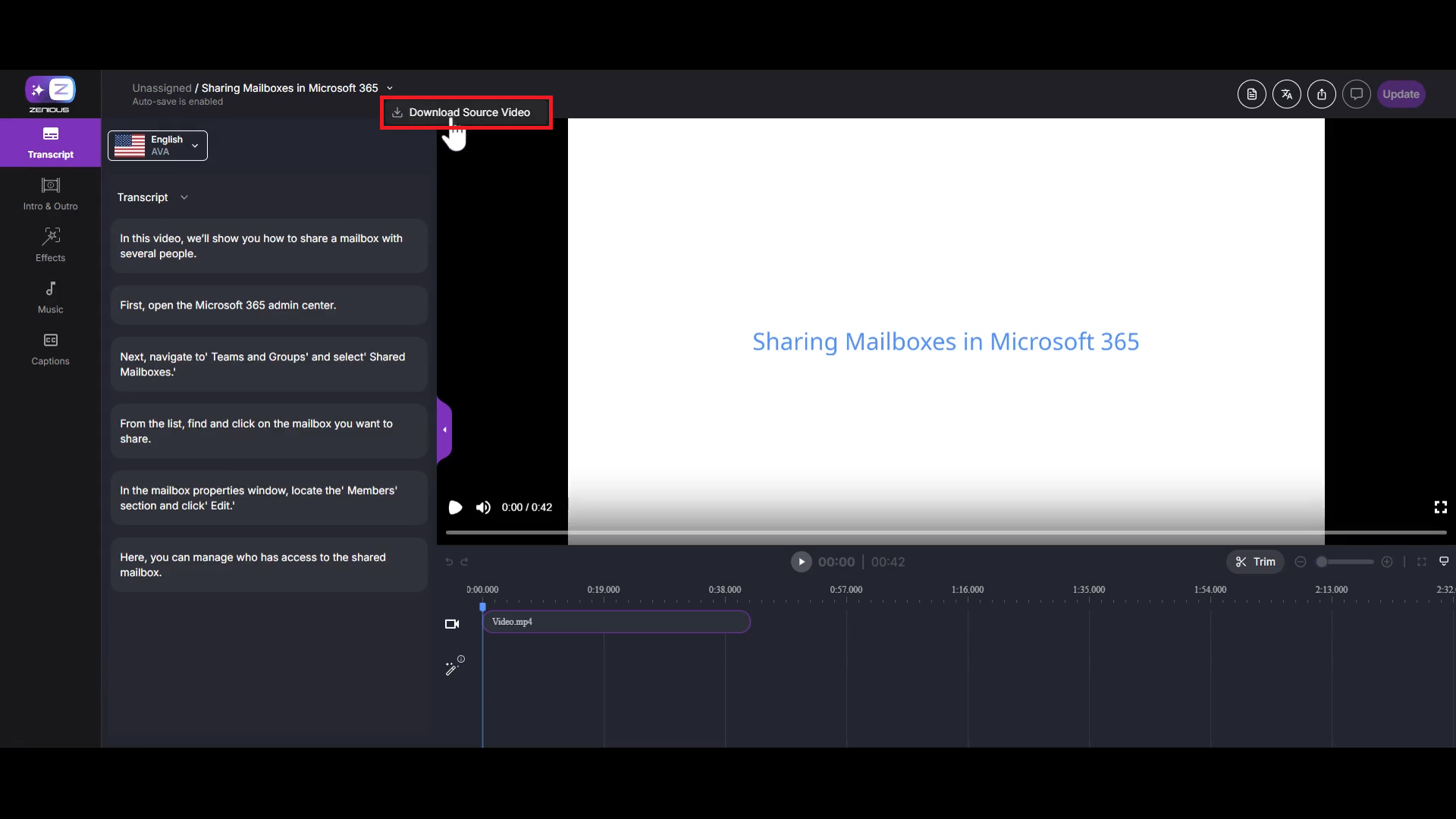 After you process a video in Zenious, Zenious automatically edits the transcript to remove filler words, improve clarity, and refine phrasing while preserving the original intent. Downloading the source video ensures you retain the original, unedited recording in case you need to reference, re-edit, or reprocess the video later.