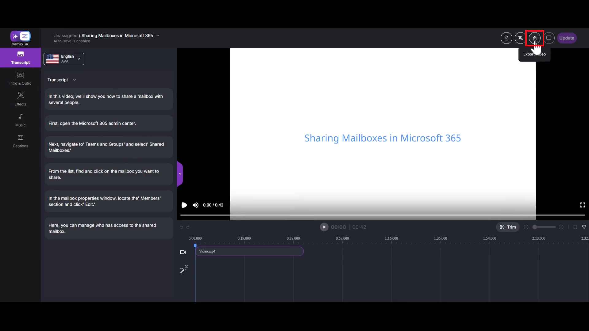 Note: Make sure all edits are finalized before exporting, as the exported video will reflect these changes. - Click Export Video.