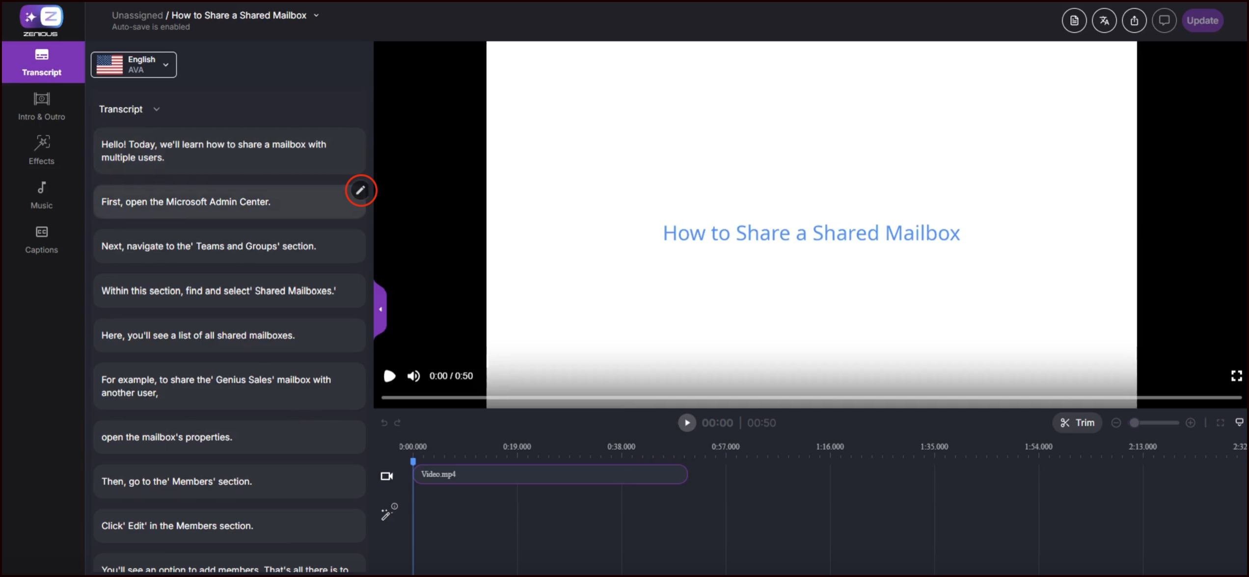 Hover over any scene and click the Edit icon to modify the transcript.