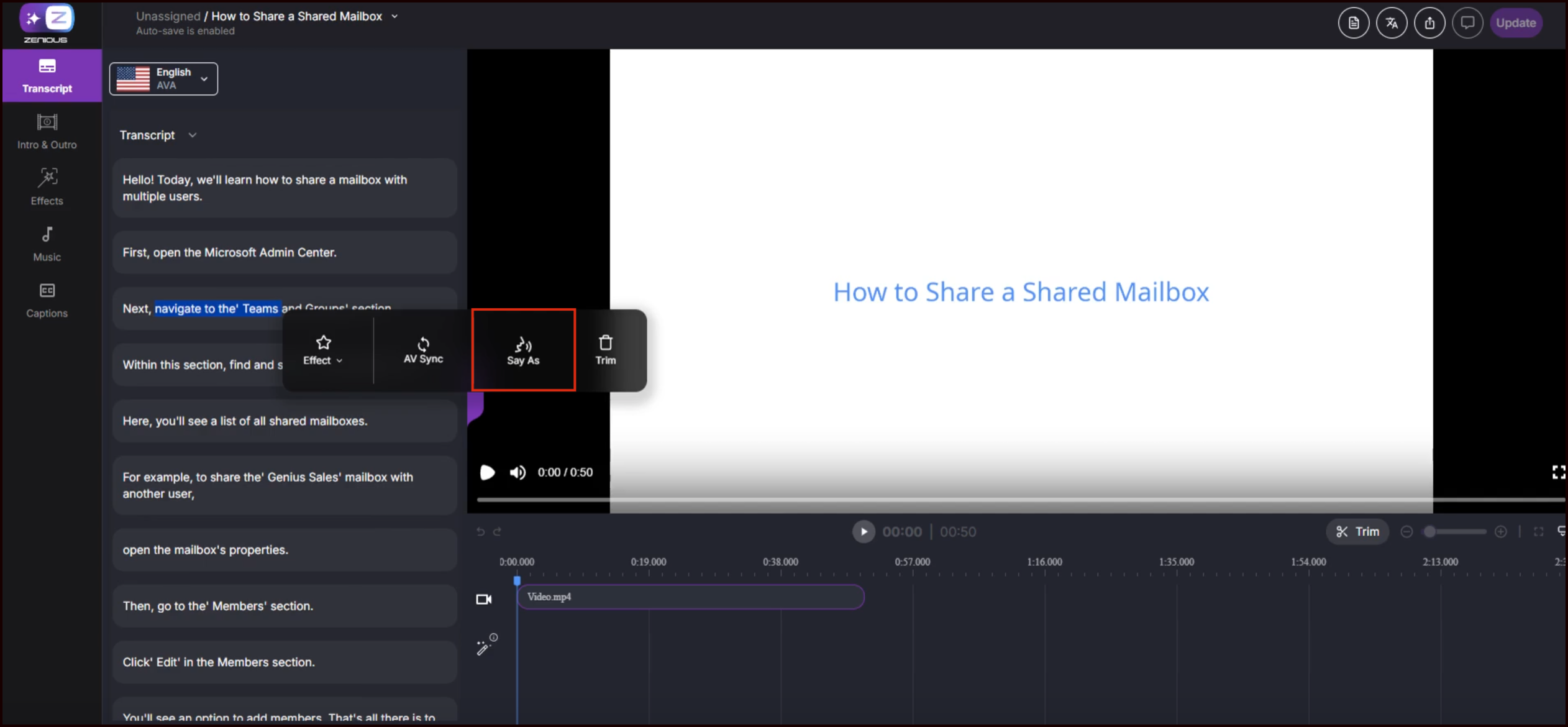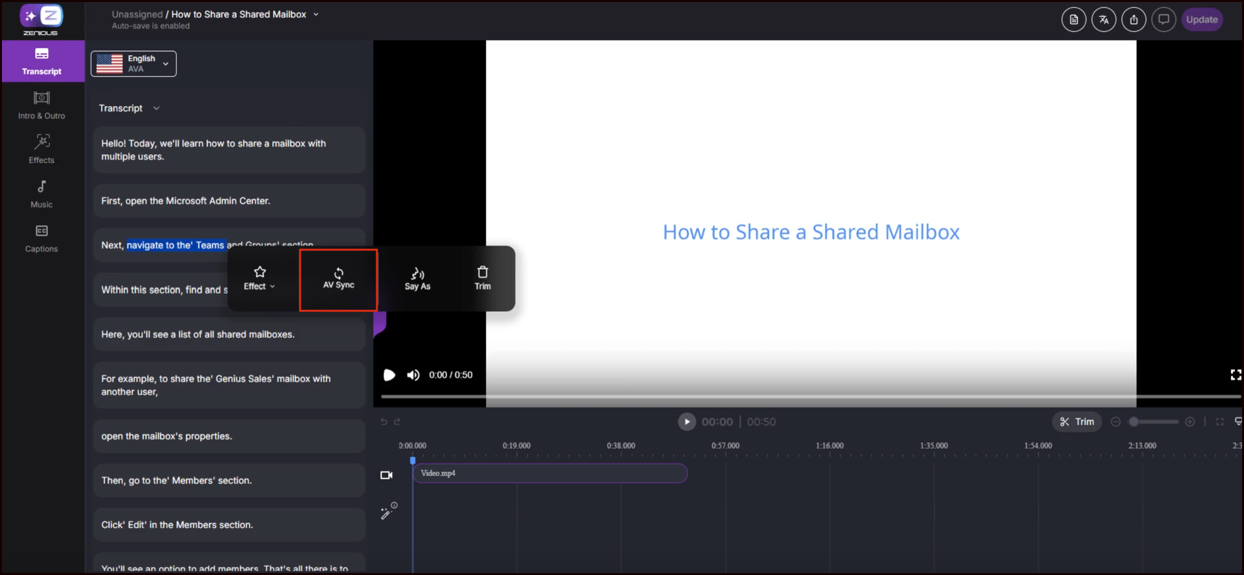 Zenious automatically transcribes your narration, removes silences and filler words, and rewrites the transcript to sound polished while keeping your original message intact. An AI-generated voice is created and synchronized with your on-screen actions.