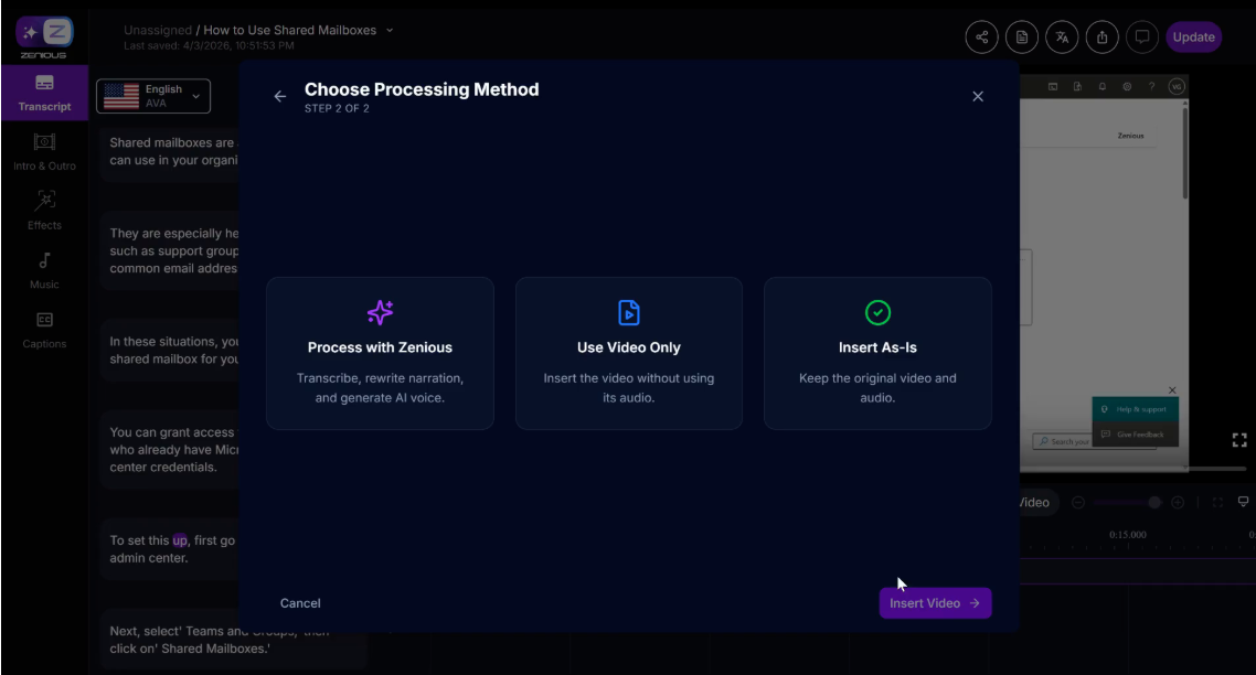 - Insert as is: Adds the video without any processing or changes from Zenious.