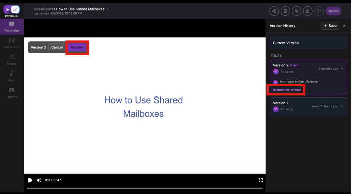 Note: Restoring a previous version will remove any changes made after that point, including the inserted video.