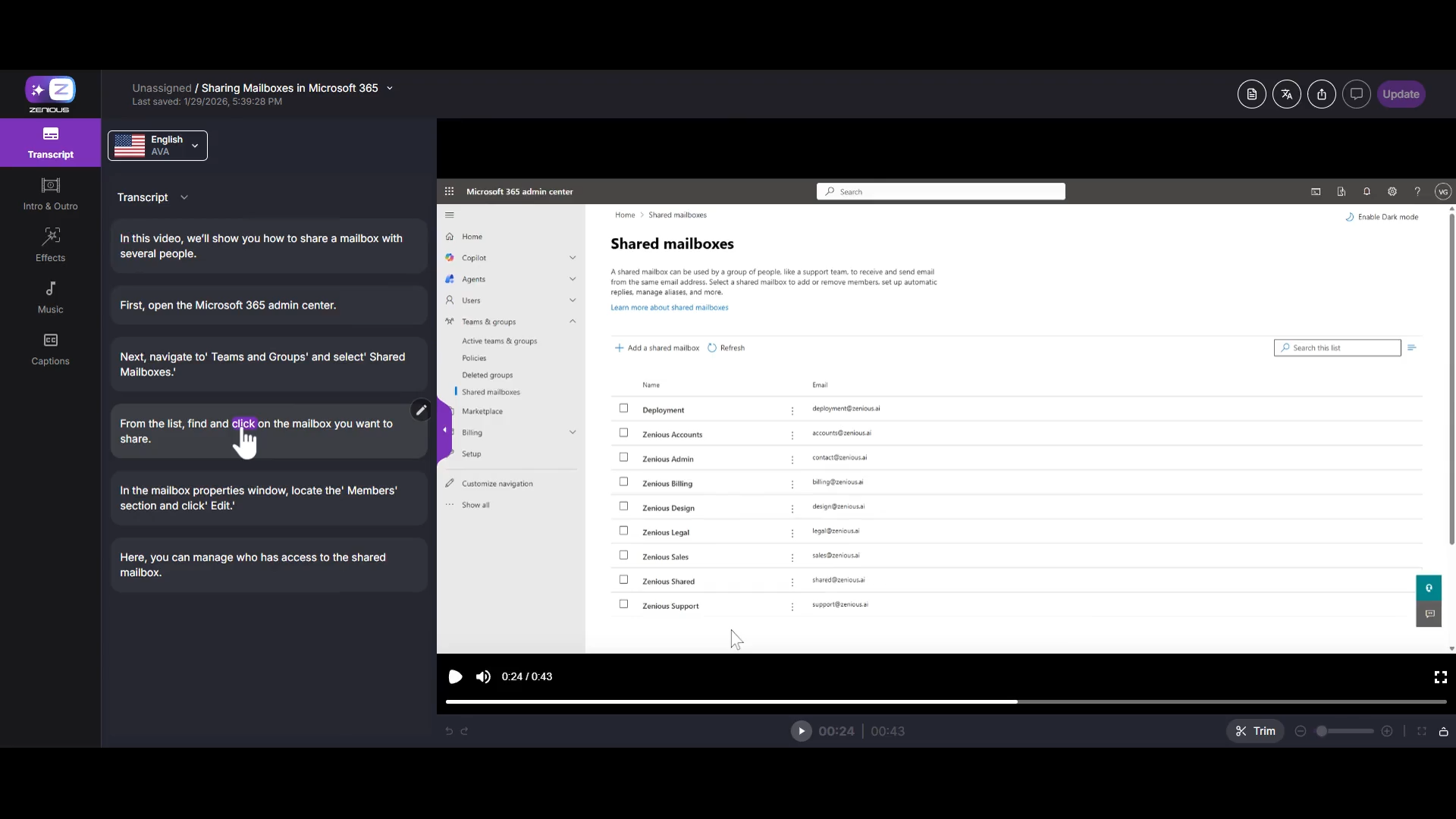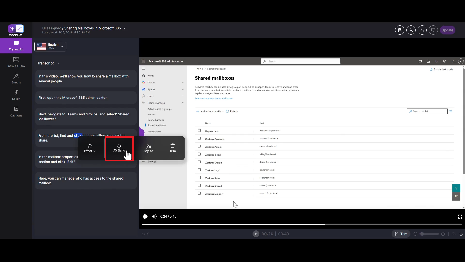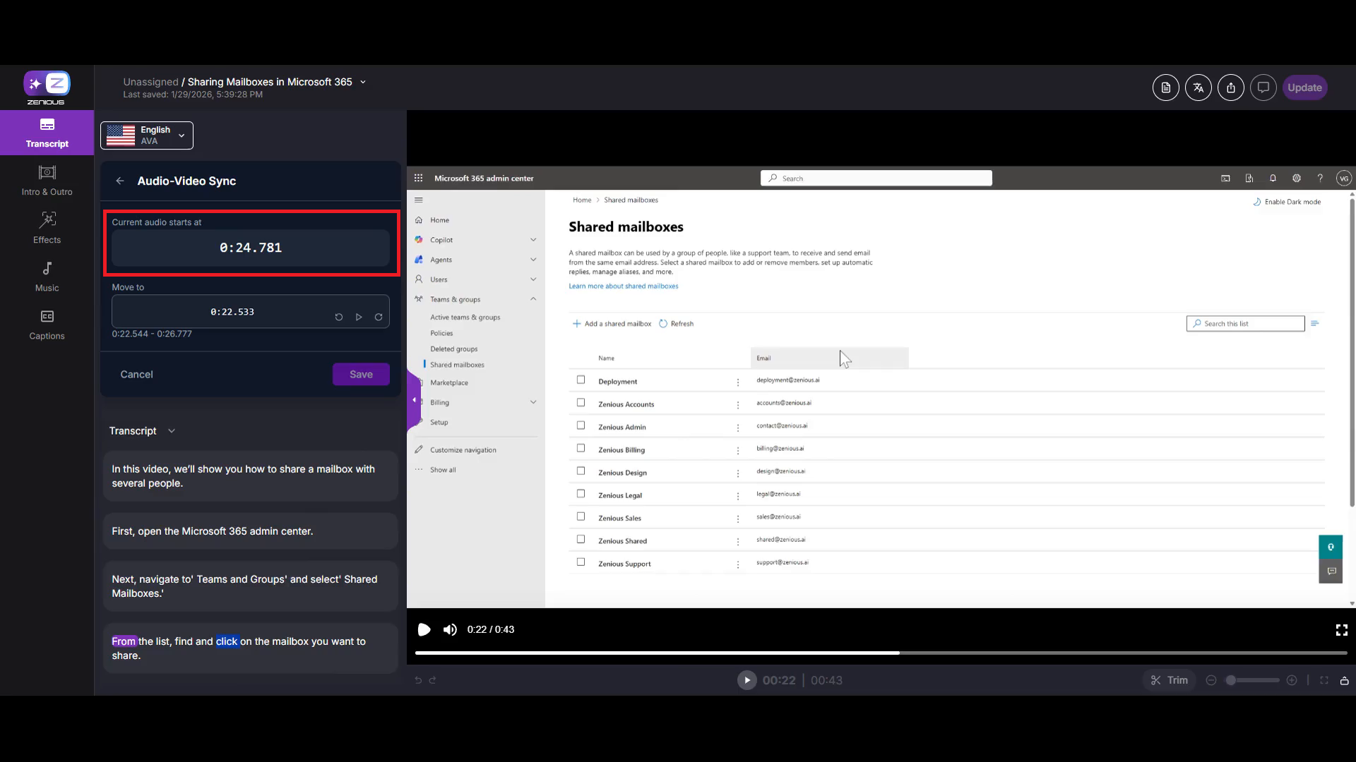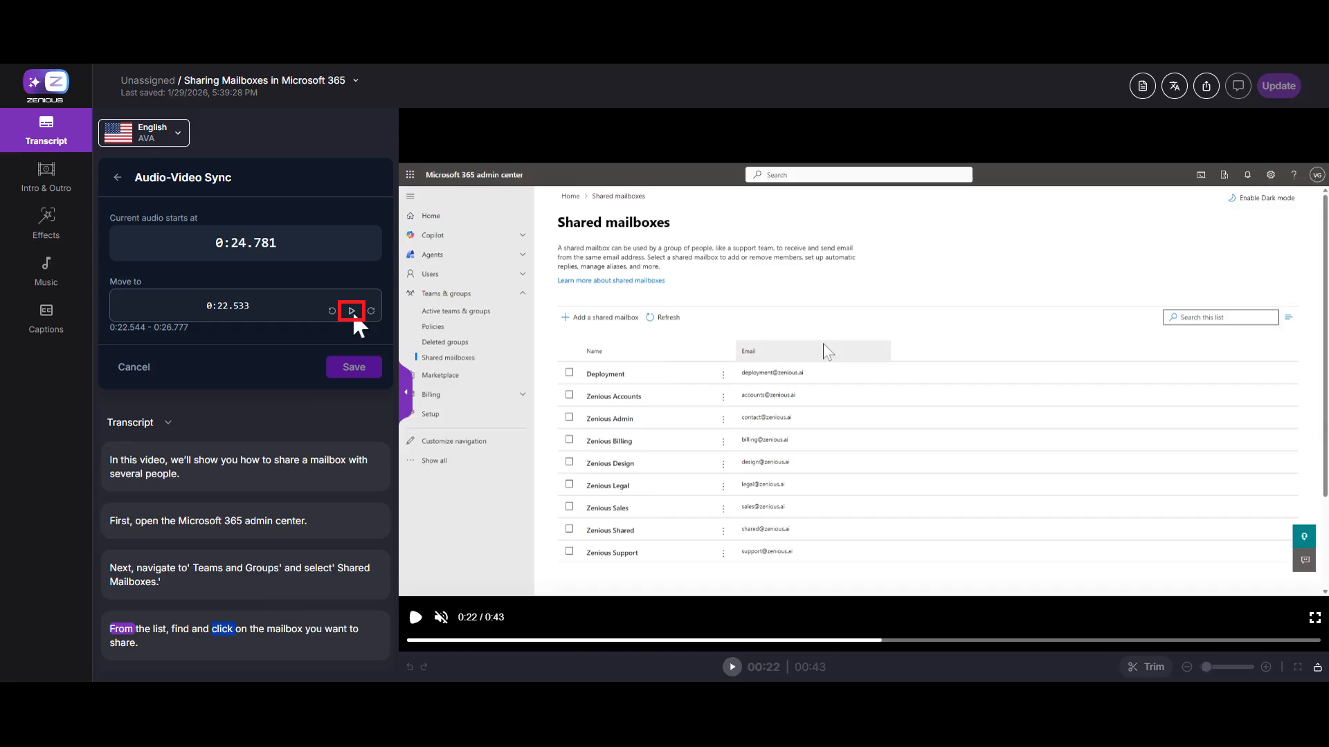 When you process a video, Zenious automatically syncs your audio and video. In some cases, where you may want to fine-tune the timing between your transcript and video frames, Zenious allows manual audio and video synchronization. This is especially useful when you want specific words in your transcript to match precise moments in your video, such as when a mouse pointer appears or an action occurs.