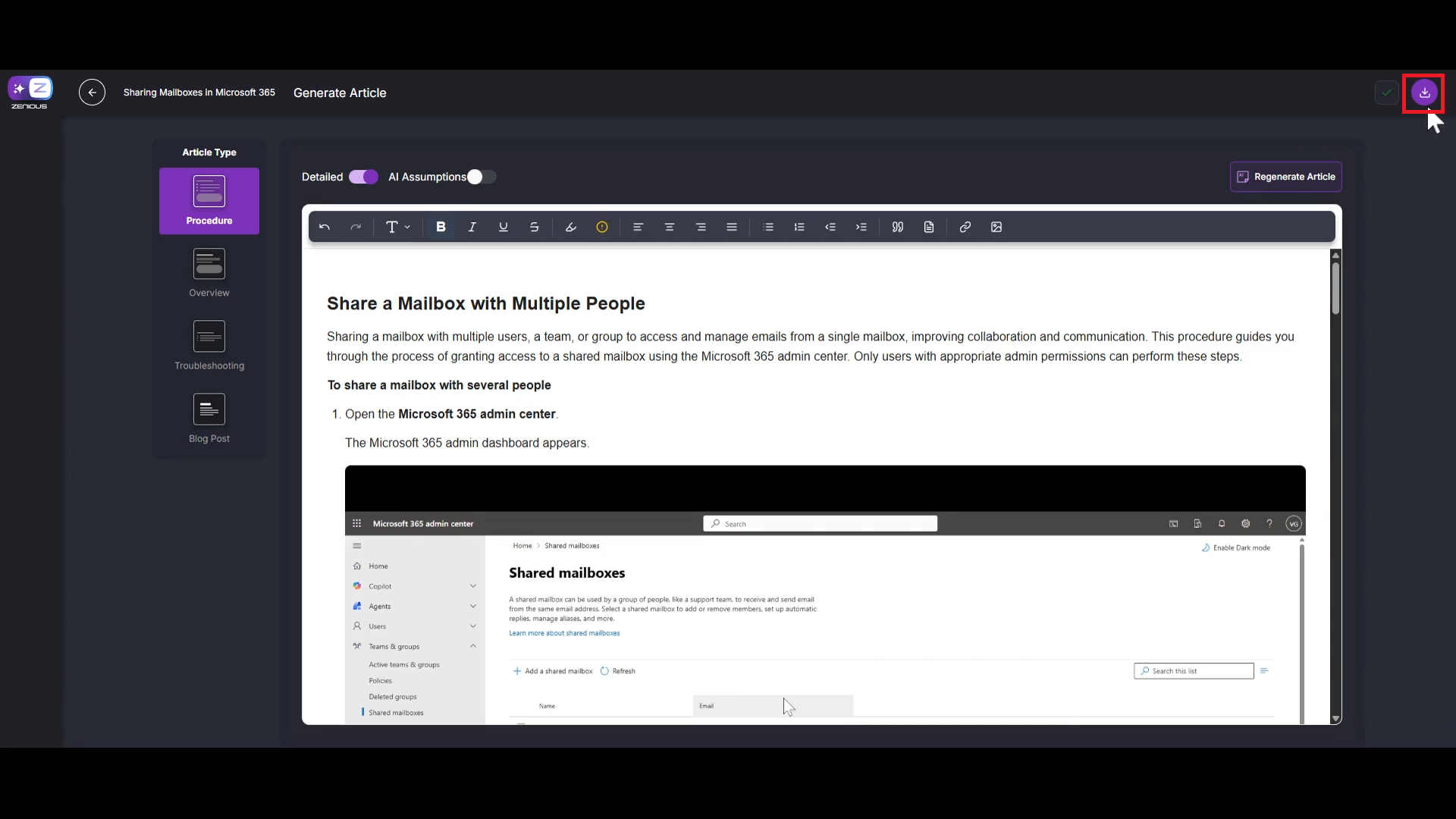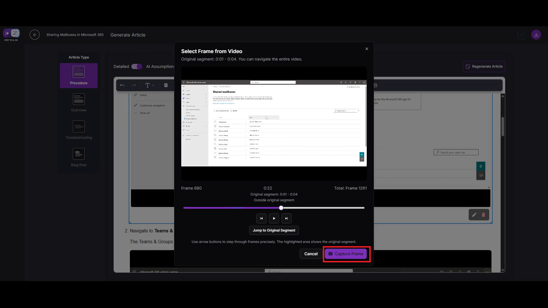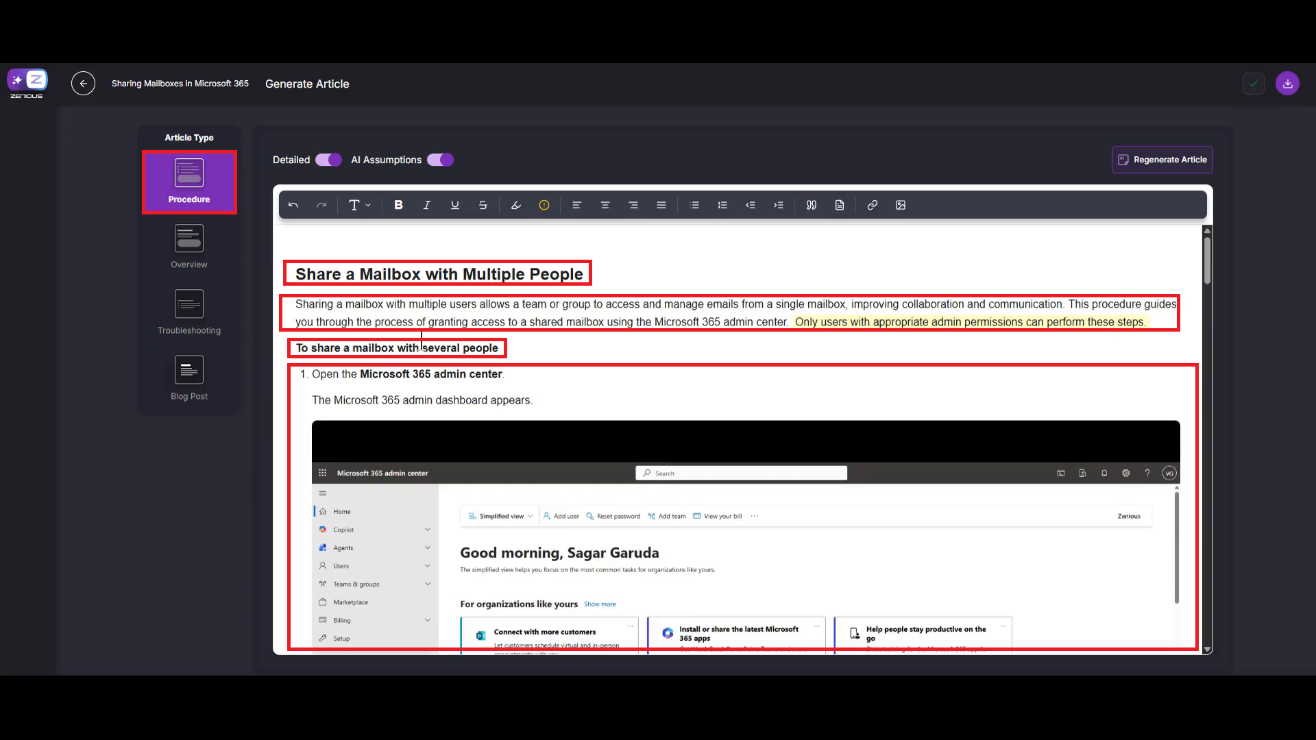 Zenious automatically creates a Procedure (step-by-step) article from the video.