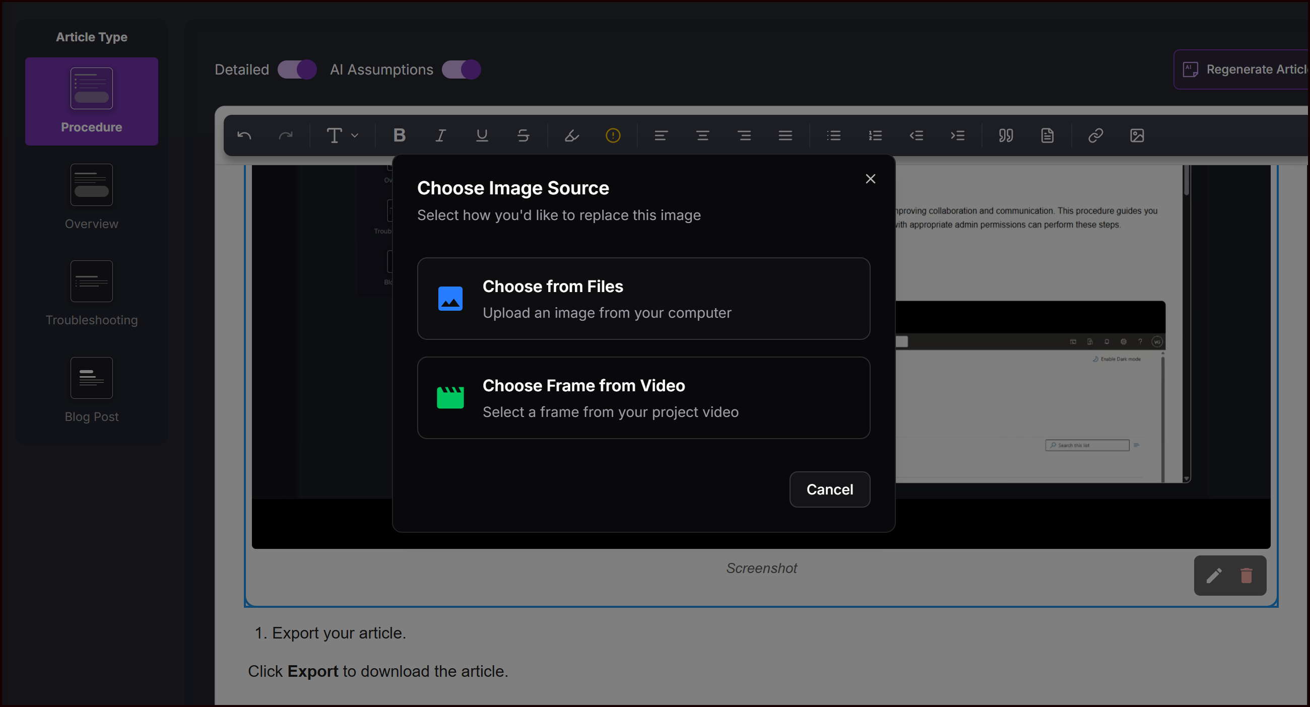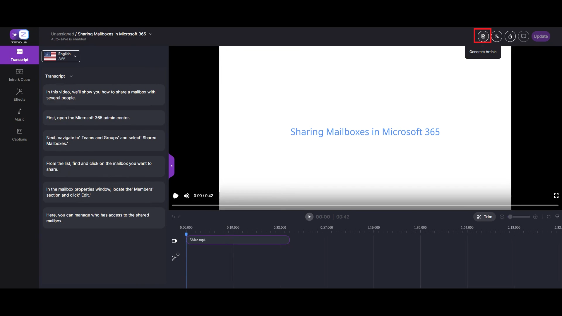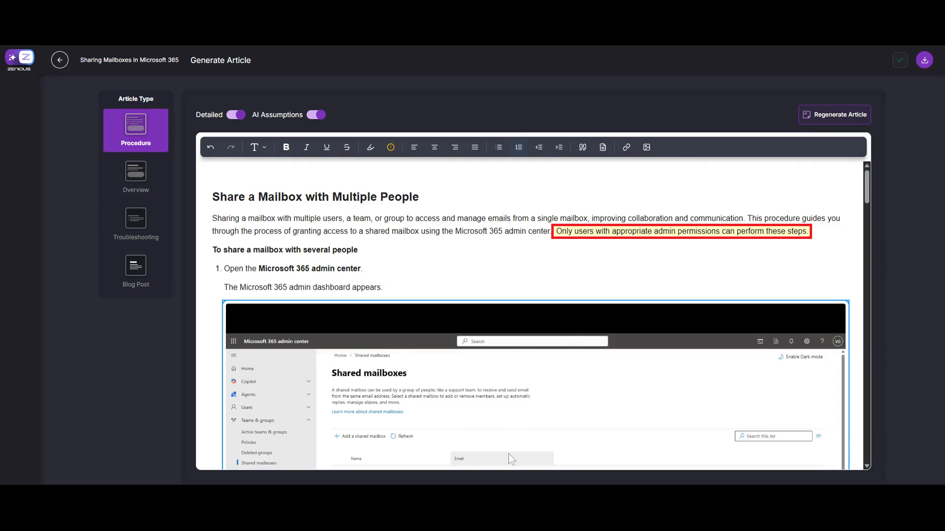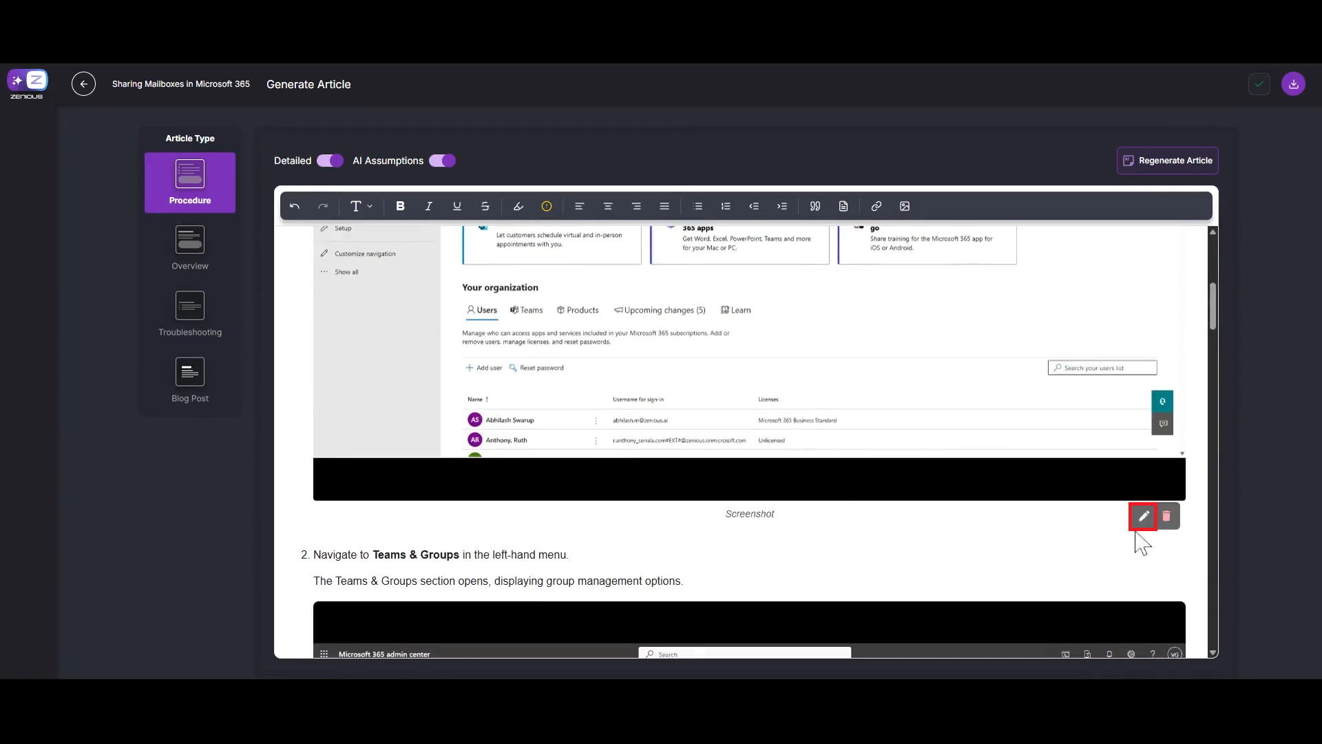 Zenious automatically creates a Procedure (step-by-step) article from the video.