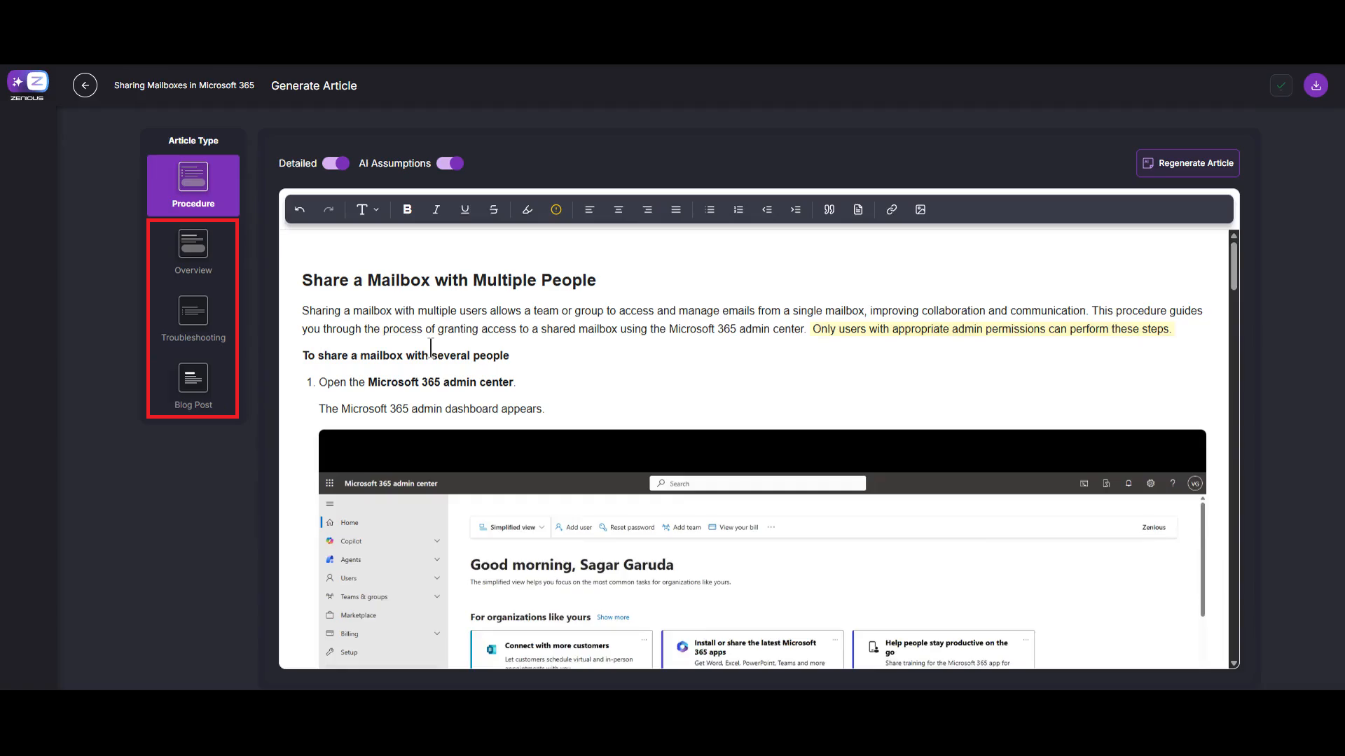 Zenious converts videos into structured articles that follow DITA and Microsoft Style & Technical Publication (MSTP) standards. Each article is generated using a clear, topic-based structure to ensure consistency, clarity, and reuse across documentation.