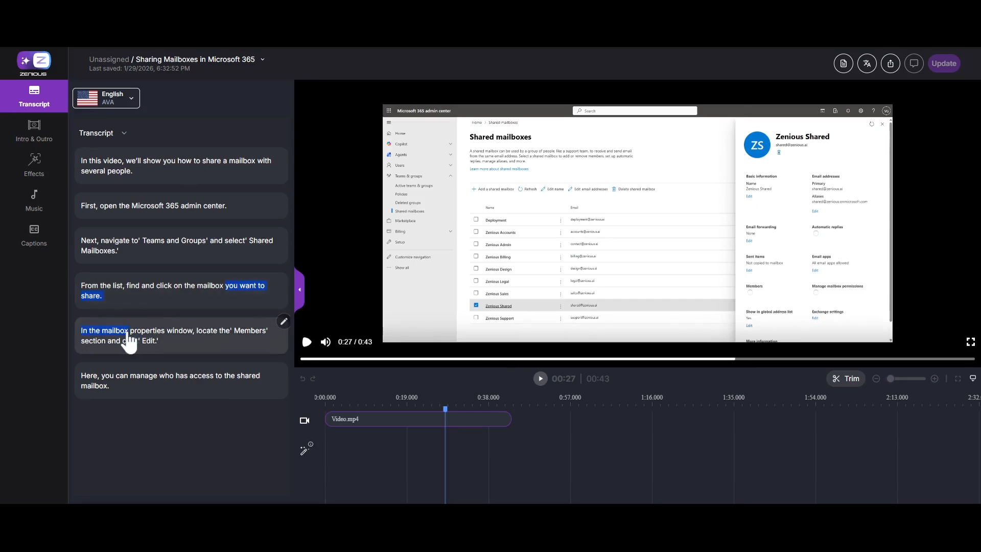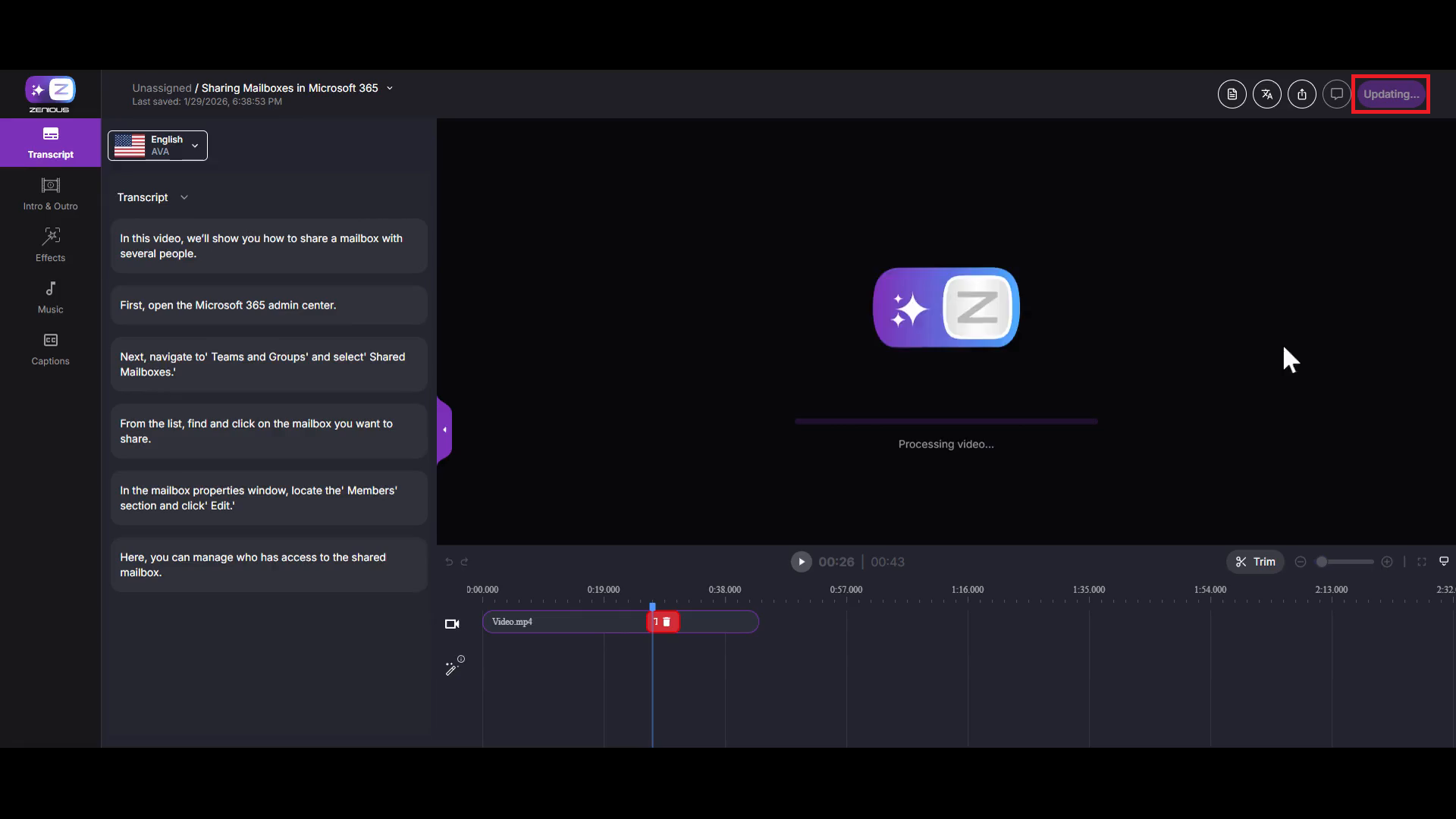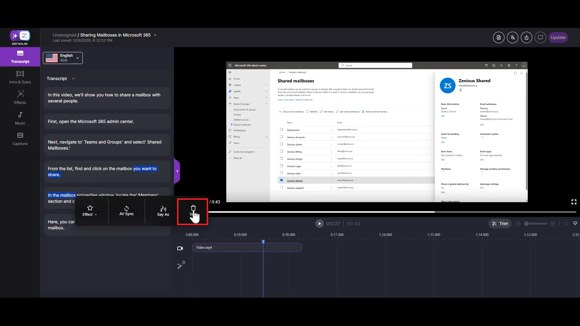 Editing and refining your video transcript in Zenious ensures your narration is accurate, clear, and tailored to your needs. Zenious automatically transcribes your narration and polishes it for a professional result, but you can easily make further ...
