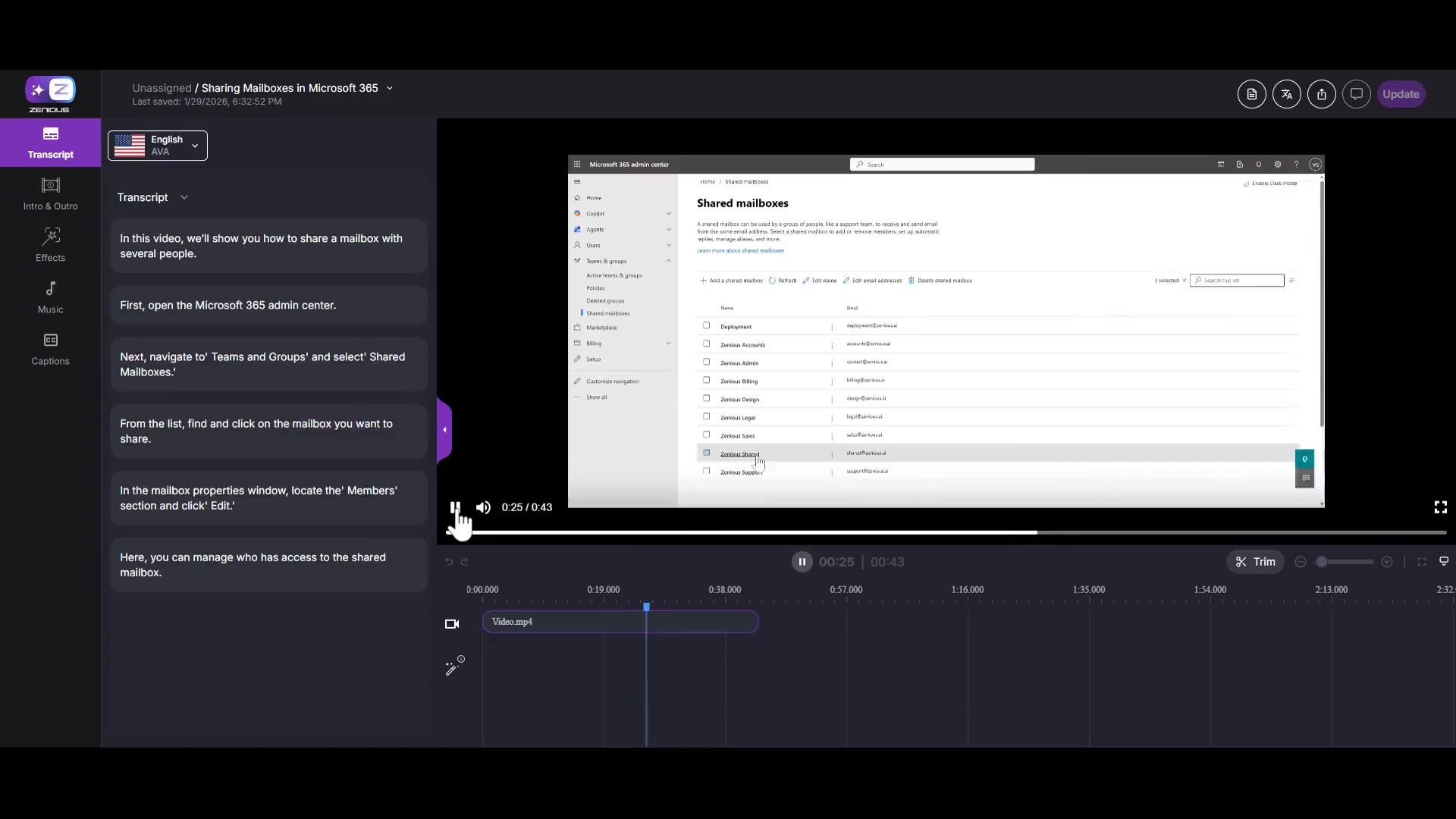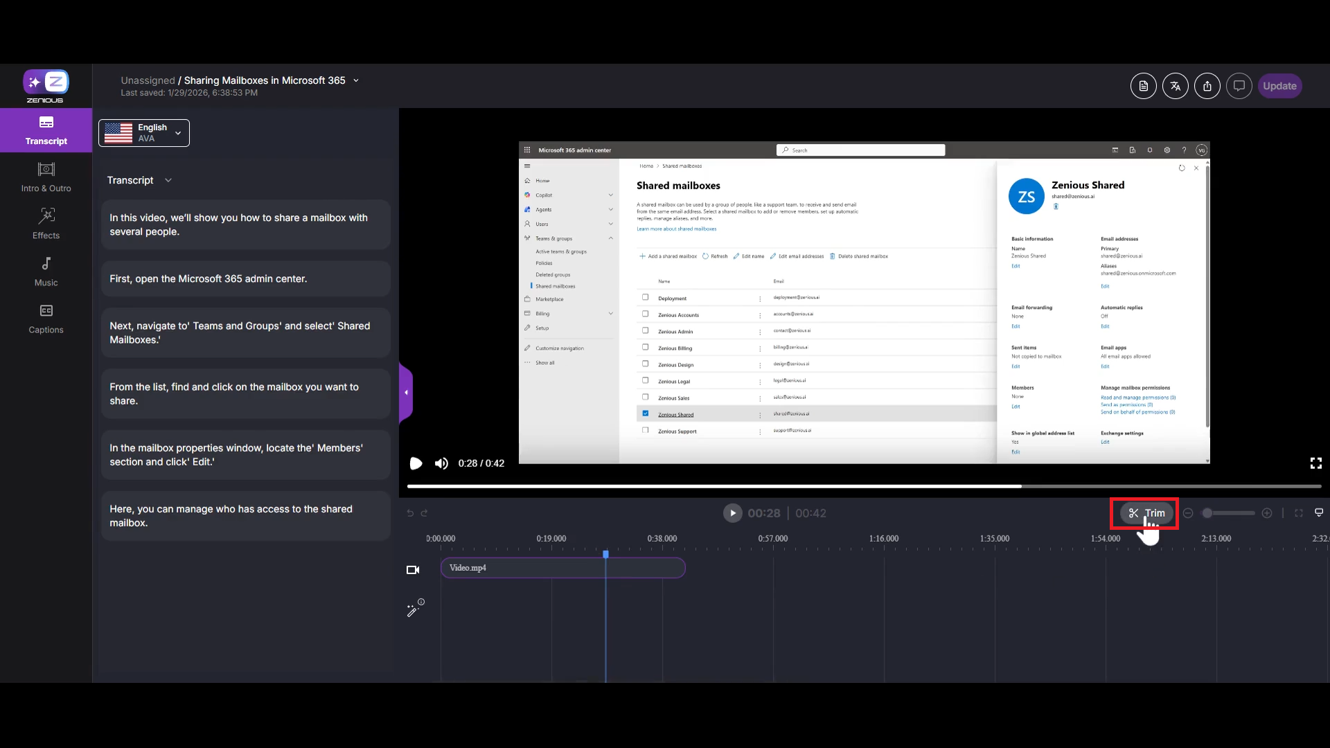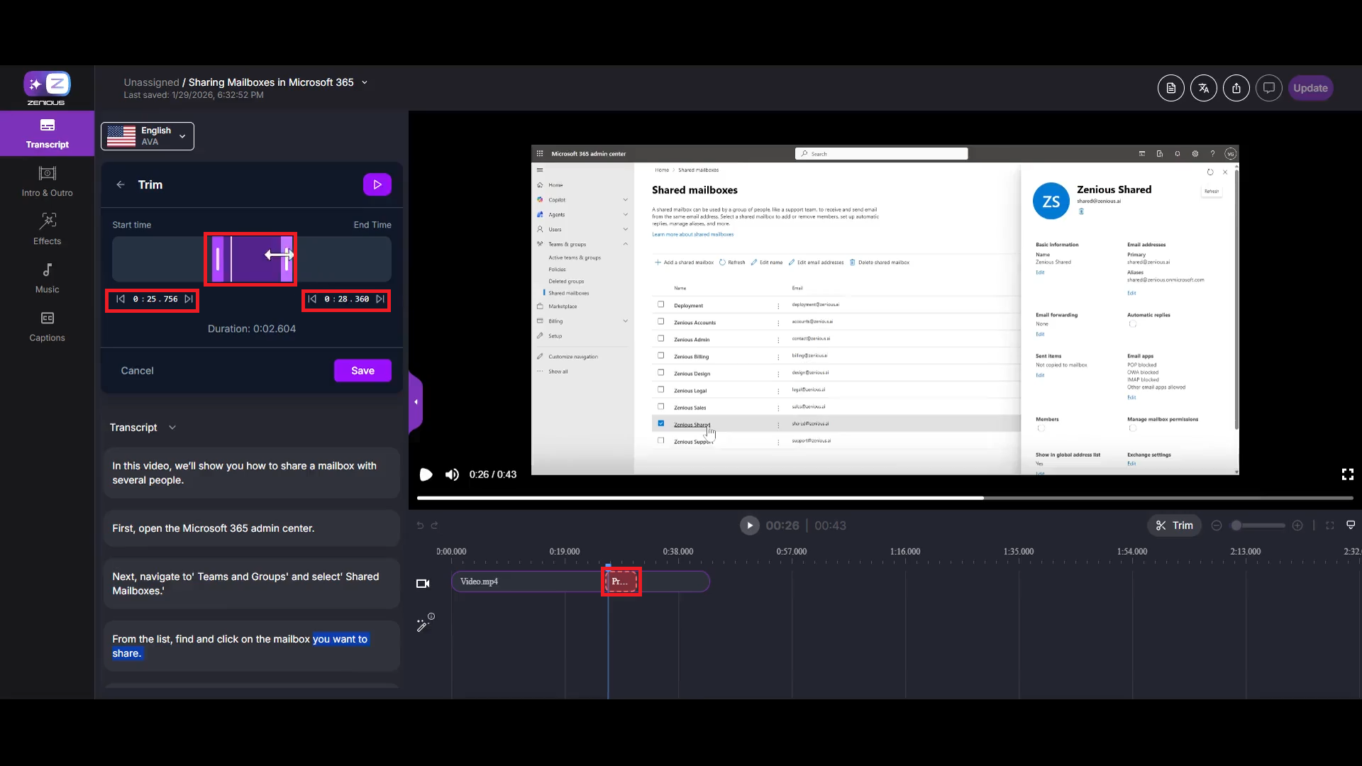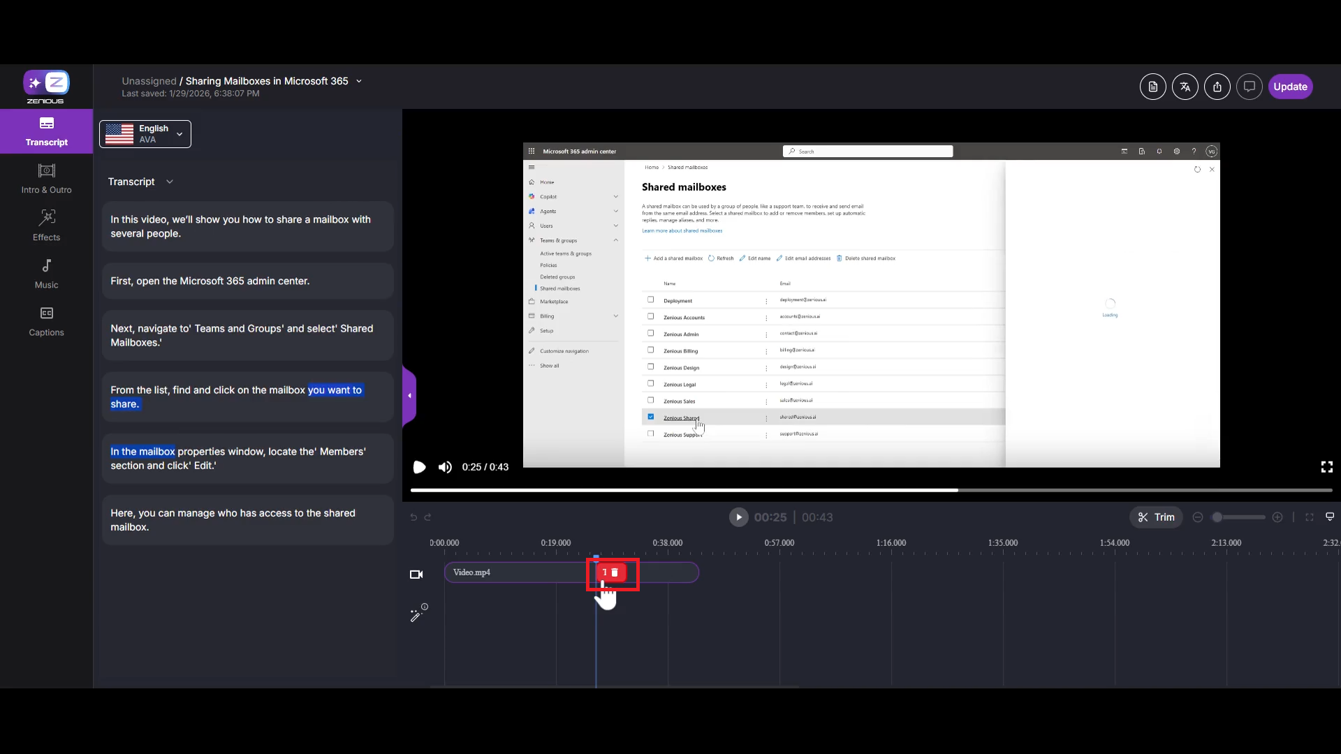 Editing and refining your video transcript in Zenious ensures your narration is accurate, clear, and tailored to your needs. Zenious automatically transcribes your narration and polishes it for a professional result, but you can easily make further ...